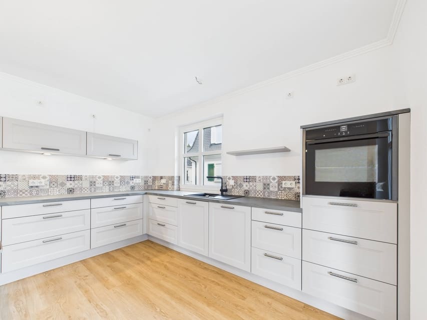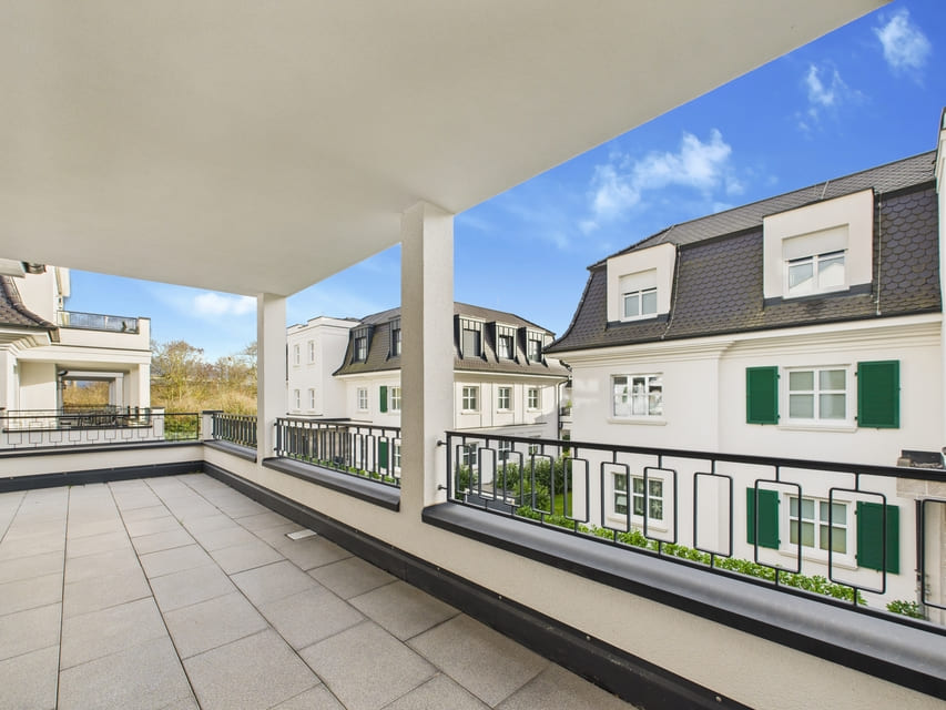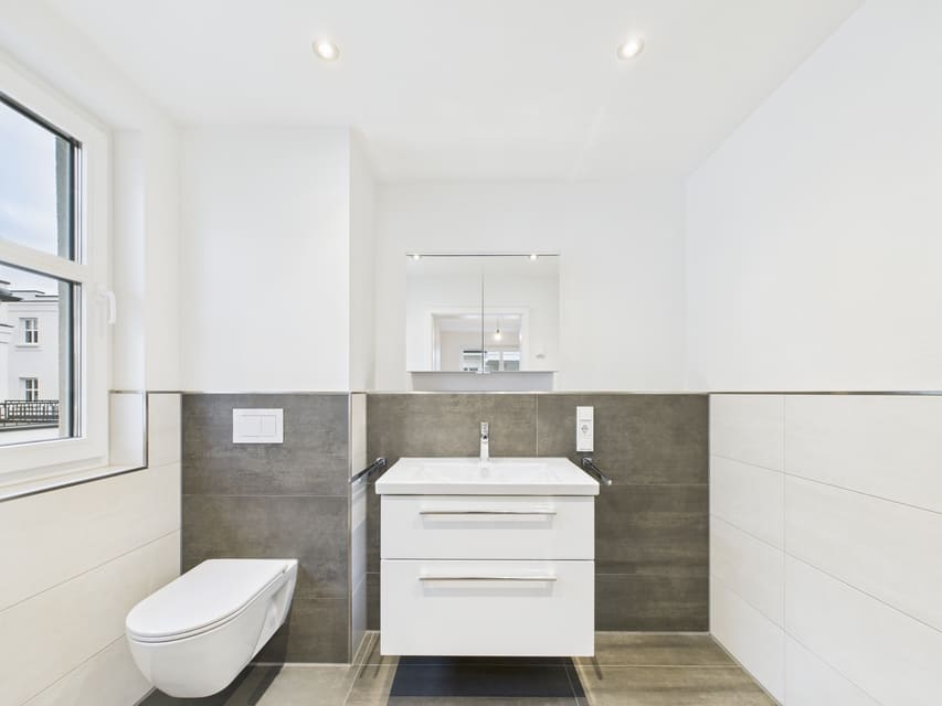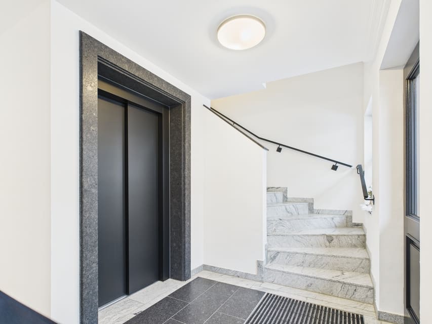 Hochwertiger Vinylboden, graue Fliesen in den Sanitärbereichen, Fußbodenheizung, dreifach verglaste Fenster und breite Türen sorgen für Komfort und Energieeffizienz. Der Zugang erfolgt über Treppenhaus oder Aufzug.