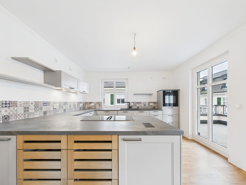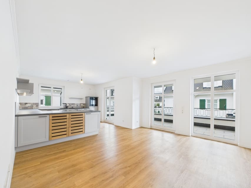 Die großzügige Diele verbindet den offenen Wohn-/Essbereich mit dem privaten Bereich. Das lichtdurchflutete Herzstück der Wohnung überzeugt mit bodentiefen Fenstern, viel Platz und einer modernen Einbauküche mit hochwertigen Geräten; ein Kühlschrank kann ergänzt werden. Der große, teilweise überdachte Südbalkon ist vom Wohnbereich aus zugänglich.